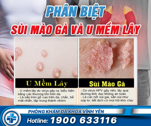Để phân biệt, cần xem xét hình dạng (sùi mào gà: chùm sần sùi; u mềm lây: tròn có lõm trung tâm), tính chất (sùi mào gà: mềm, ẩm, dễ vỡ; u mềm lây: cứng hơn) và nguyên nhân (sùi mào gà do HPV; u mềm lây do virus khác).